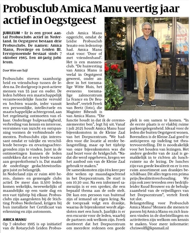 Maak kennis met Probusclub Amica Manu, een nieuwe gebruiker in het Dorpscentrum `Oegstgeest. Lees het artikel dat vandaag verscheen in de Oegstgeester Courant.